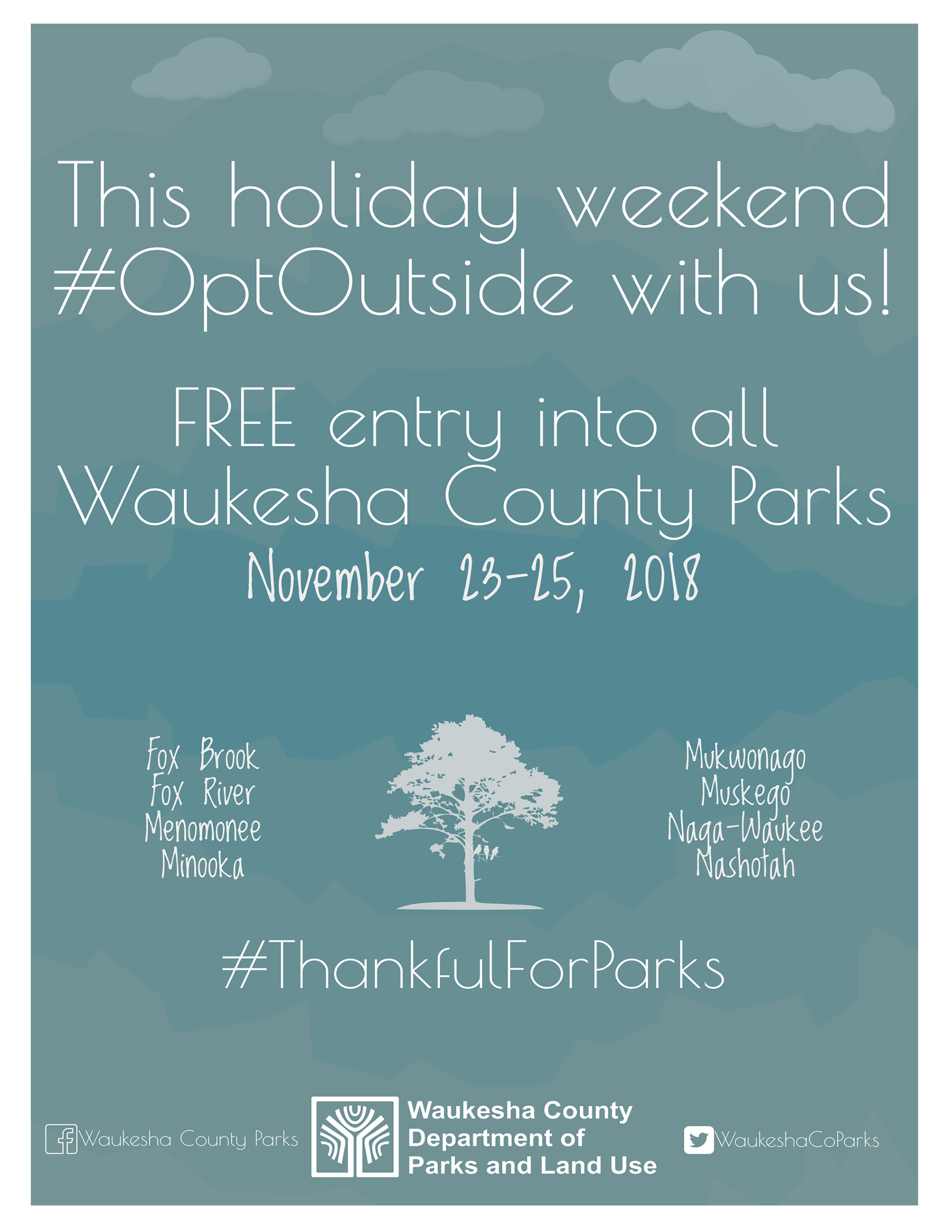 “I’m so thankful for our county’s fantastic park system and the beautiful natural resources they each have to offer,” said Paul Farrow, Waukesha County Executive. “Opt outside with your family and friends over the holiday weekend and share your experiences with us by using our hashtag, #ThankfulForParks, on social media.”